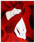 2006terug naar ...geborgenheid. Een vrouw in foetushouding, haar (rode) haren deinen mee op de stroming van het levenswater. ze stelt zich kwetsbaar op